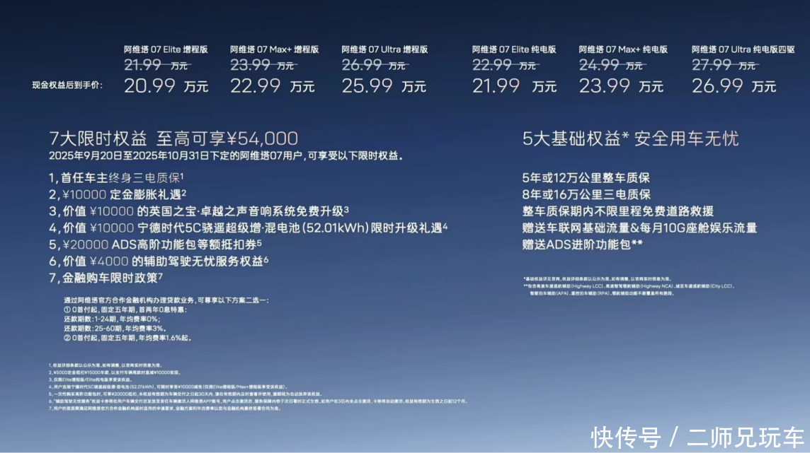 与此同时,针对本次阿维塔07 2026款的上市,阿维塔还推出了重磅购车礼遇。2025年10月31日(含)前大定用户可享7大限时权益:首任车主终身三电质保、10000元定金膨胀礼遇、价值10000元的英国之宝·卓越之声音响系统免费升级、价值10000元宁德时代5C骁遥超级增·混电池(52.01kWh)限时升级礼遇、20000元ADS高阶功能包等额抵扣券、价值4000元的辅助驾驶无忧服务权益、金融购车限时政策。